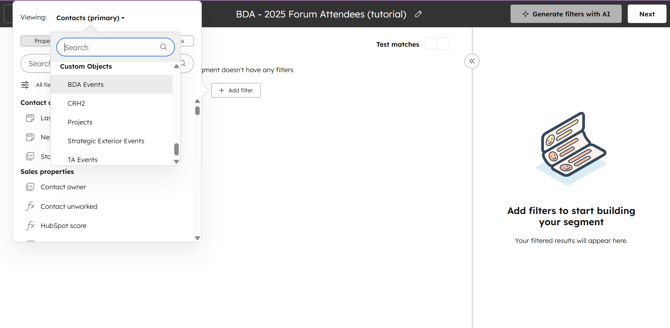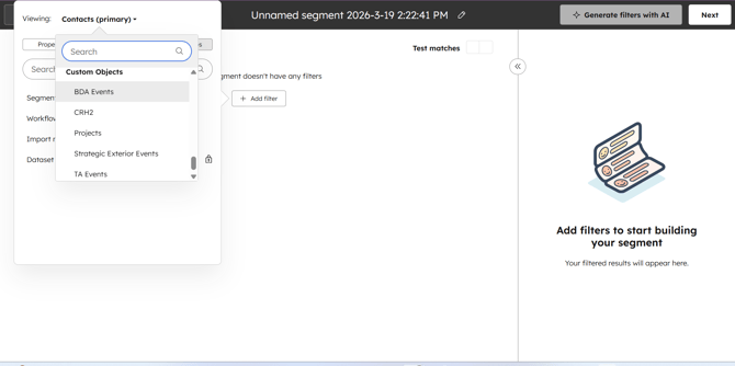 Add Filter - Viewing - Custom Objects - BDA events